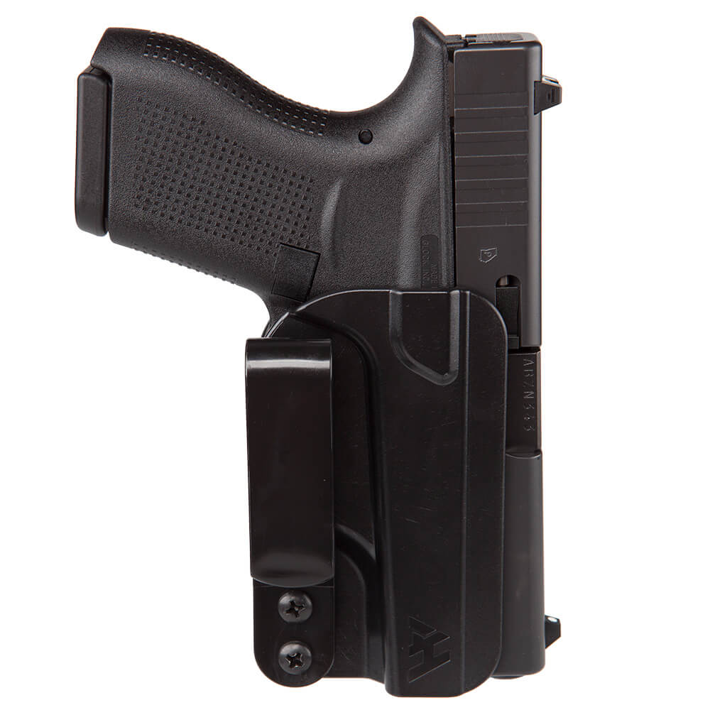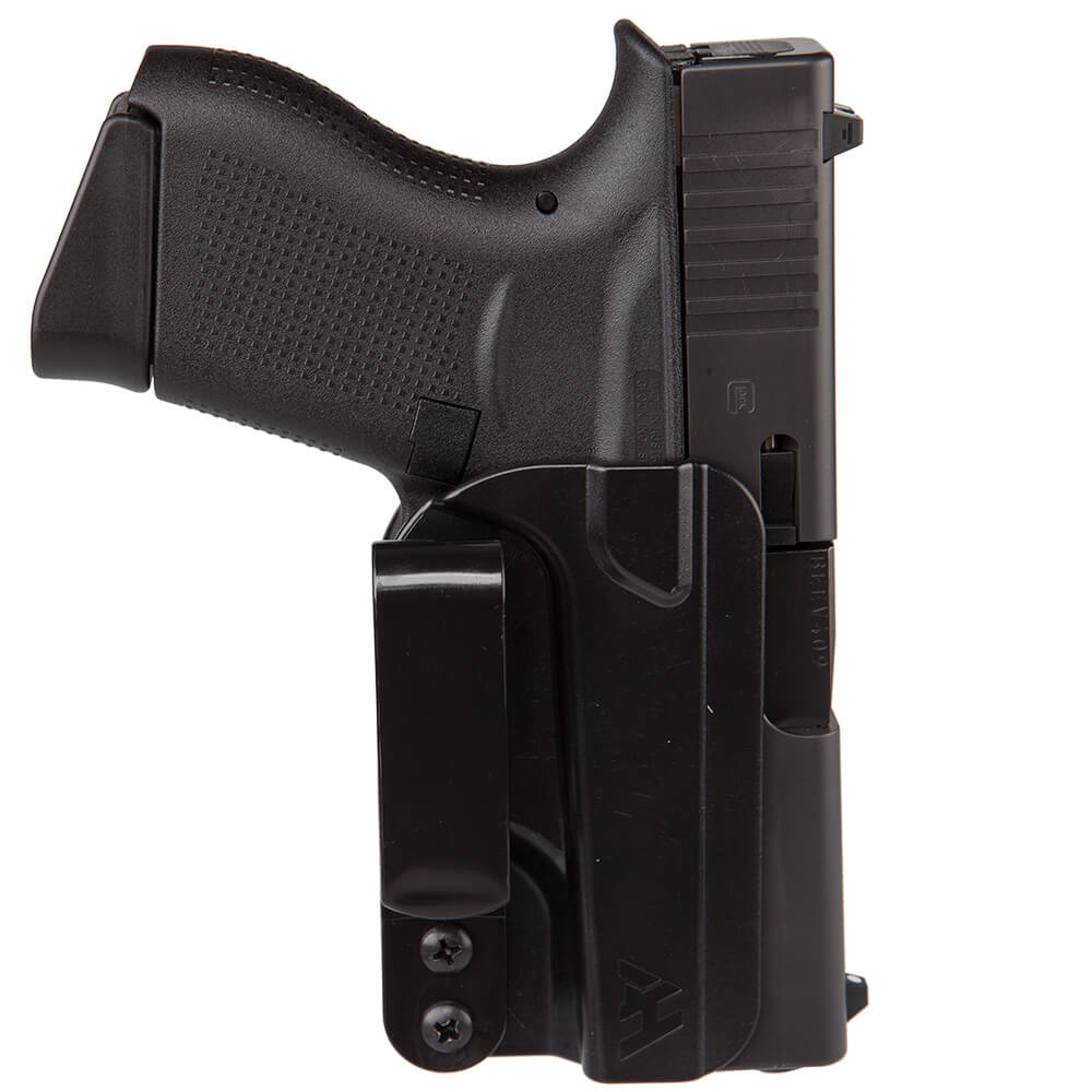 This is the smallest and lightest holster we’ve seen for the G42/43 siblings, yet it’s completely functional and extremely versatile. It is a well designed IWB holster that fits the slim frame Glocks perfectly. The belt clip is black and basically looks like a belt loop on your pants. Cover this with a t-shirt or sweater and no one will ever suspect that you are carrying
