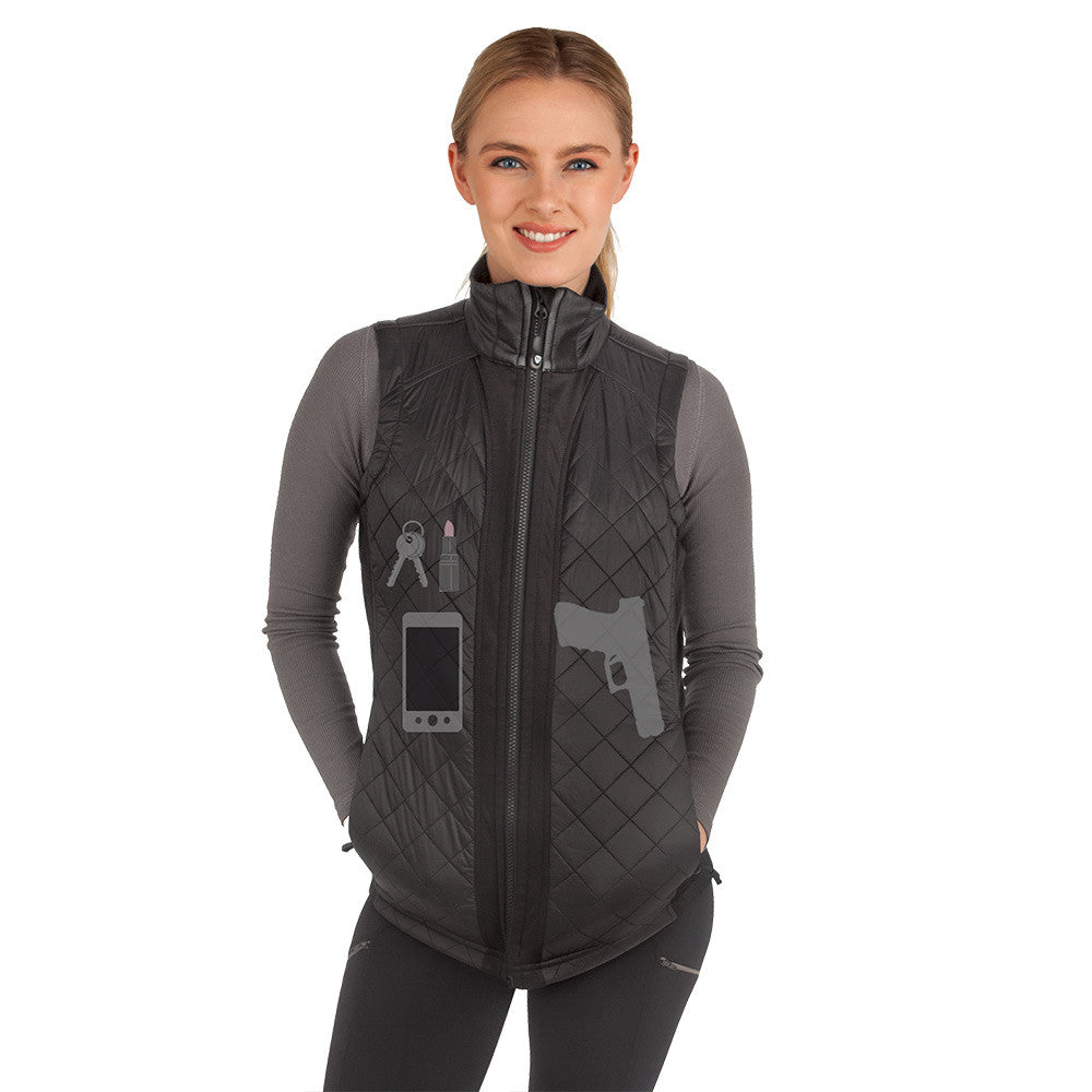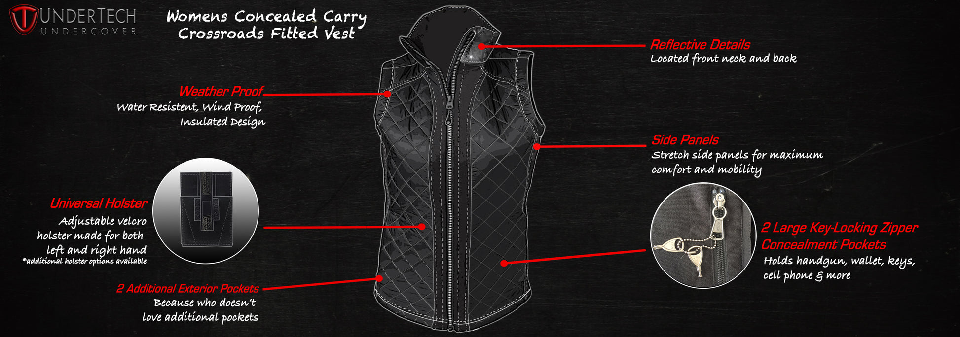 The Crossroads Vest is truly your best and most fashionable concealment option. Perfect for those cool days hiking, walking the dog, jogging, and yet attractive enough to wear shopping and out around town. This vest features beautifully quilted insulation, stretch side panels, and reflective details with zoned ventilation, all in a water-resistant package. It makes a great layer under your outerwear jacket on the extra cold days, Our Crossroads Vest is designed with dual key locking zipper concealment pockets and comes with a universal handgun holster that uses velcro to attach inside allowing you to conceal and carry most self-defense handguns with comfort and readiness. Use the other pocket to store magazine, cell phone, keys, documents, wallet and more.