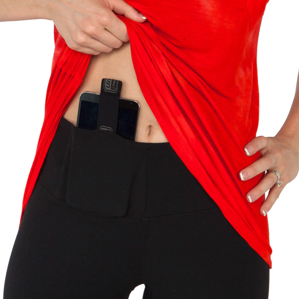 This is the Most Comfortable and Fashionable Concealment Solution Available for everyday wear! UnderTech UnderCover is the world's leading brand of concealment clothing. These stylish and comfortable leggings are made of the same material, and feature the same fit, as the most popular workout brands in the industry. They are 3/4 length also known as mid-calf and features two built-in holsters, one in the back for a traditional "kidney" position and the other in the front for a traditional "appendix" position. This allows you to choose which is most comfortable, and concealable, based on your particular activity and clothing. Both holsters feature a patent pending retention strap that helps secure your handgun yet makes it readily available in case you need it. The same holster pockets will also securely hold and carry your mobile phone, credit card, keys, etc.